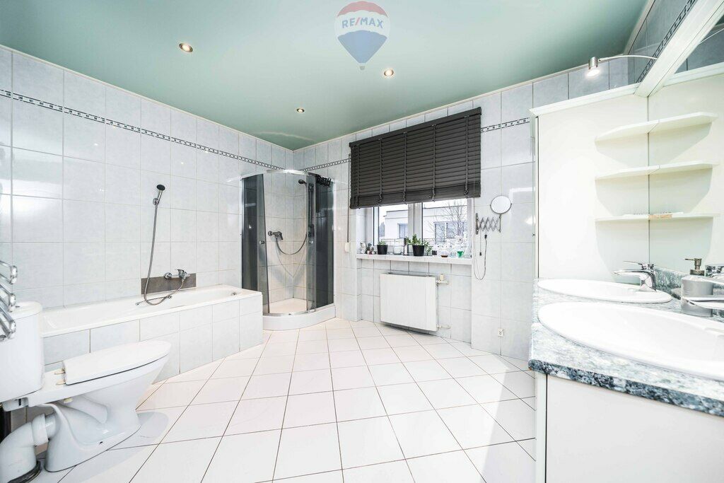 obszerna łazienka z wanną i prysznicem oraz dwoma umywalkami;